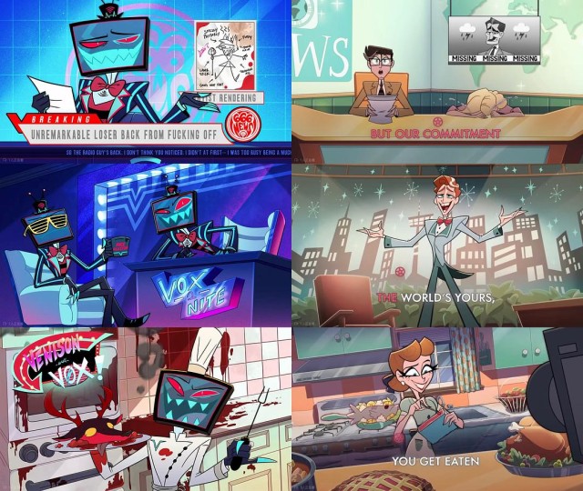 从sinner和生前形象对比能看出Vincent的右眼是正常的瞳色,左眼才是虹膜异色症导致的。Shakespeare的《Othello》里说“嫉妒”是“绿眼睛的怪物”,所以也能理解为什么他嫉妒心那么强了。 歌词里,Vox说自己要变成Supernova。Supernova是星星凋亡前最后一步,爆炸会照亮整个星系——显然PV里Vincent头上电视掉下来的时候,也照亮了所有人。 作为RadioStatic/RadioSilence的粉丝完全没想到会卖那么大……Alastor和Vox的人生到罪人生都是完全平行对立的。在人间Alastor因为肤色被歧视动了手,制作人们在他努力下也对他的能力保持怀疑;长相标致的白男Vox出于纯粹的嫉妒心和贪婪猎杀,而制作人们全心全意给他机会捧红他被恩将仇报。在地狱里Alastor因交易获得权利,成为了最强的领主;而Vox只是无名小卒,又一次从头开始攀登权利顶峰。 最后破防流泪说其他人无所谓了Alastor必须死真是令人没想到…… 其他想到再写。 你要问我了,这么诡异的作品你是怎么看下来的呢,首先我喜欢musical,其次都musical了诡异的剧情我看得多了已半脱敏。